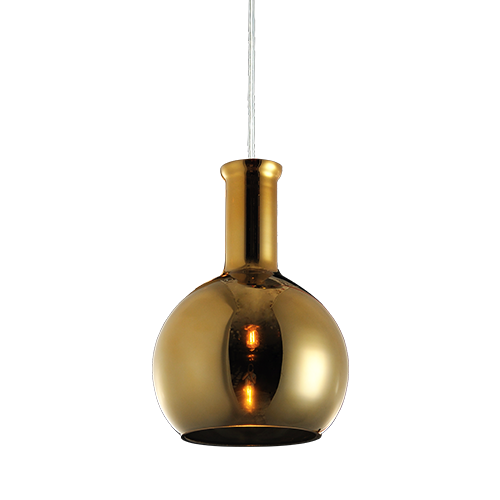 Pendente com uma cúpula em vidro dourado e canopla em aço. Cabo ajustável em até um metro.