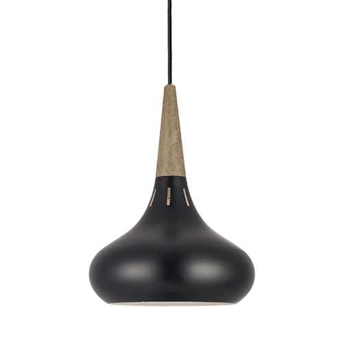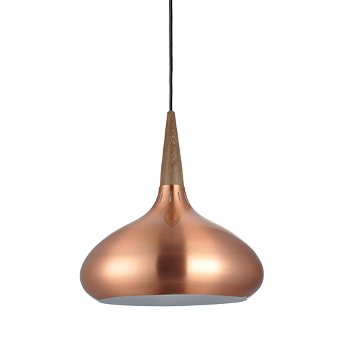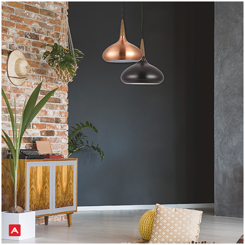 Pendente com uma cúpula em aço na cor preta ou cobre, com base em madeira e canopla em aço. Cabo ajustável em até um metro.